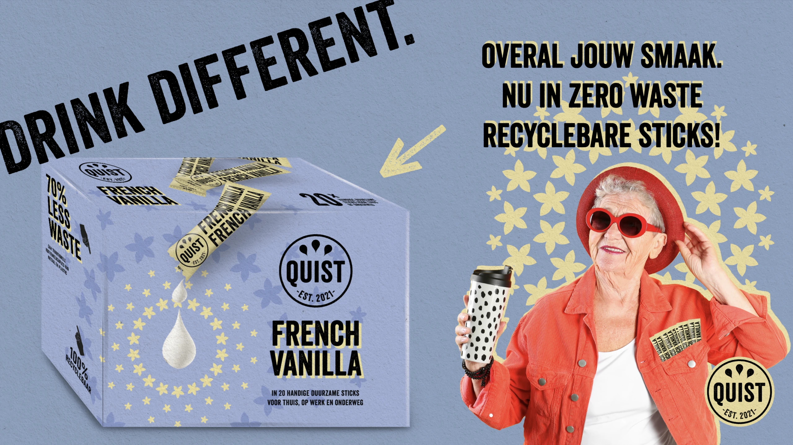 Quist is ook een statement. De sticks zijn 100% recyclebaar en produceren aantoonbaar minder CO₂, minder water en minder afval dan traditionele koffiemelkcupjes.